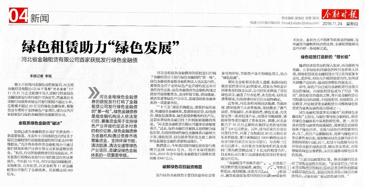 河北金租綠色金融債券的獲批發行打響了金融租賃公司發行綠色金融債的“第一槍”。綠色金融債券是指金融機構法人依法發行的、募集資金用于支持綠色產業并按約定還本付息的有價證券。綠色金融債券為金融機構通過債券市場籌集資金,支持環保節能、清潔能源、清潔交通等綠色產業項目,是建設綠色金融體系的一項重要舉措。