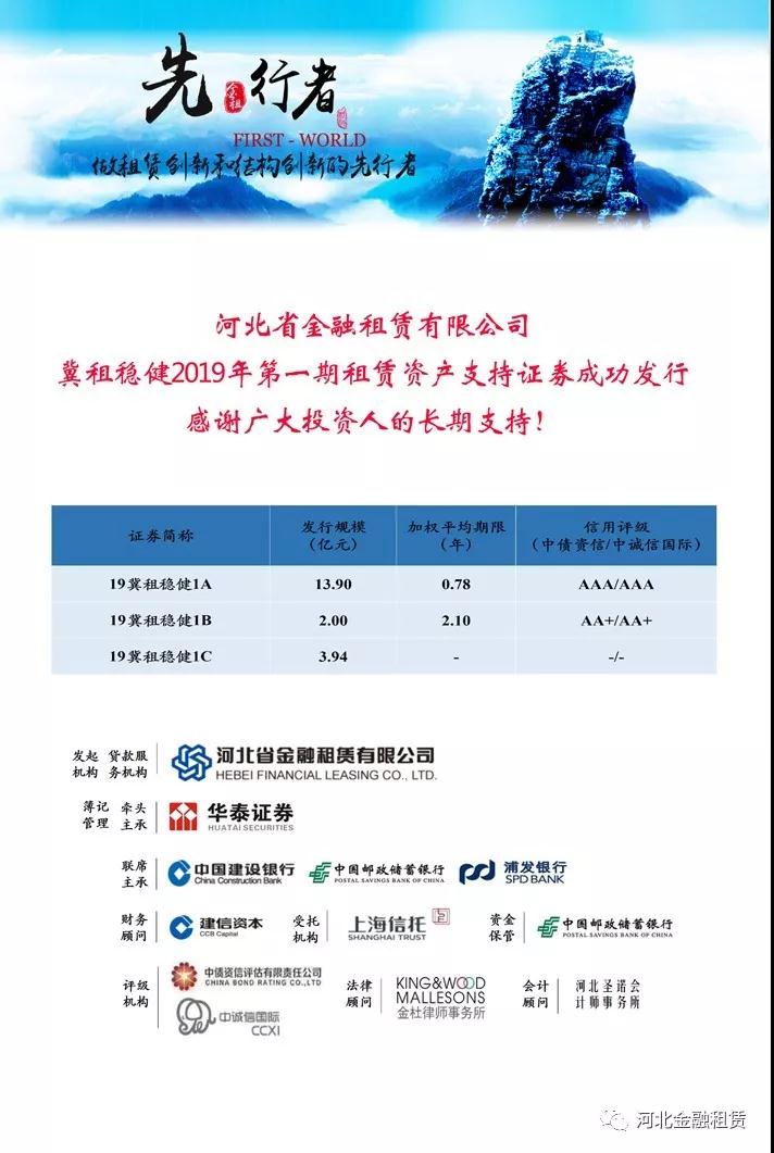 日前,河北省金融租賃有限公司(以下簡稱“河北金租”)冀租穩健2019年第一期租賃資產支持證券在銀行間債券市場成功簿記建檔發行,合計金額19.84億元。
