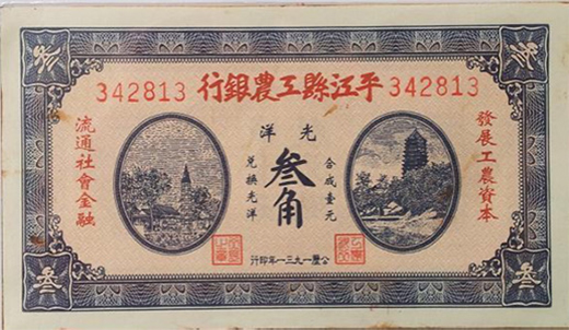 1933年12月4日經(jīng)中共川陜省委批準(zhǔn),川陜省蘇維埃政府工農(nóng)銀行(又稱(chēng)為“中華蘇維埃共和國(guó)川陜省工農(nóng)銀行”)在通江縣成立,工農(nóng)銀行總行行長(zhǎng)和造幣廠廠長(zhǎng)均由紅四方面軍總供部部長(zhǎng)鄭義齋兼任。工農(nóng)銀行的主要任務(wù)是“制造蘇維埃貨幣, 統(tǒng)一幣制, 流通蘇區(qū)金融, 實(shí)行對(duì)工農(nóng)的低息和無(wú)息貸款, 幫助合作社的發(fā)展。”在通江蘇維埃時(shí)期,工農(nóng)銀行共印鑄有布幣、紙幣、銅幣、銀幣等四種蘇幣,是土地革命戰(zhàn)爭(zhēng)時(shí)期發(fā)行貨幣種類(lèi)最多的銀行,總流通量達(dá)280萬(wàn)元。