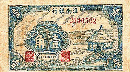 淮南銀行1942年成立,行址設于江蘇淮安盱眙縣,發行淮南幣通行于淮南地區各縣。1945年8月與淮北地方銀號、江淮銀行、鹽阜銀行、淮海銀行4個地方銀行合并組成華中銀行。