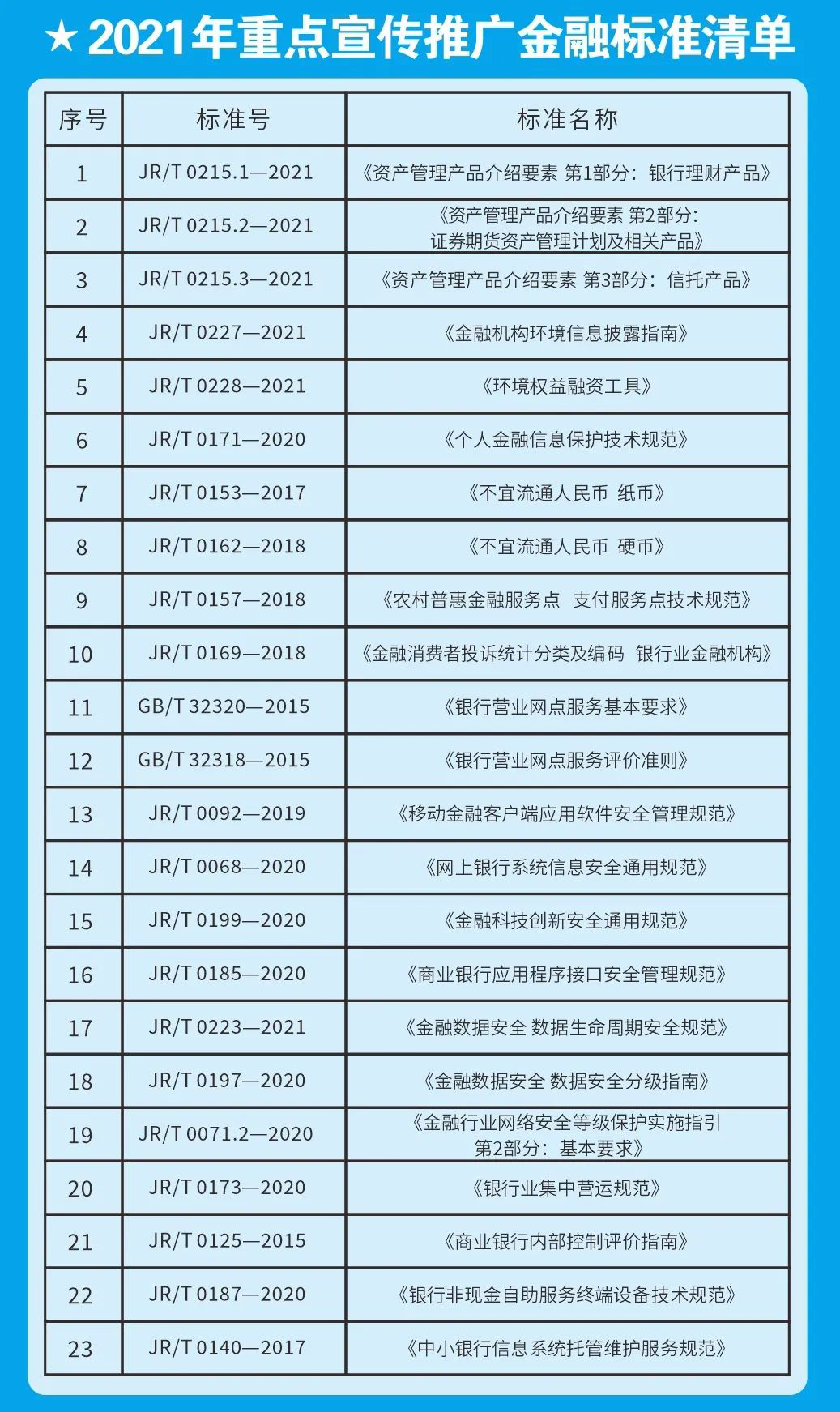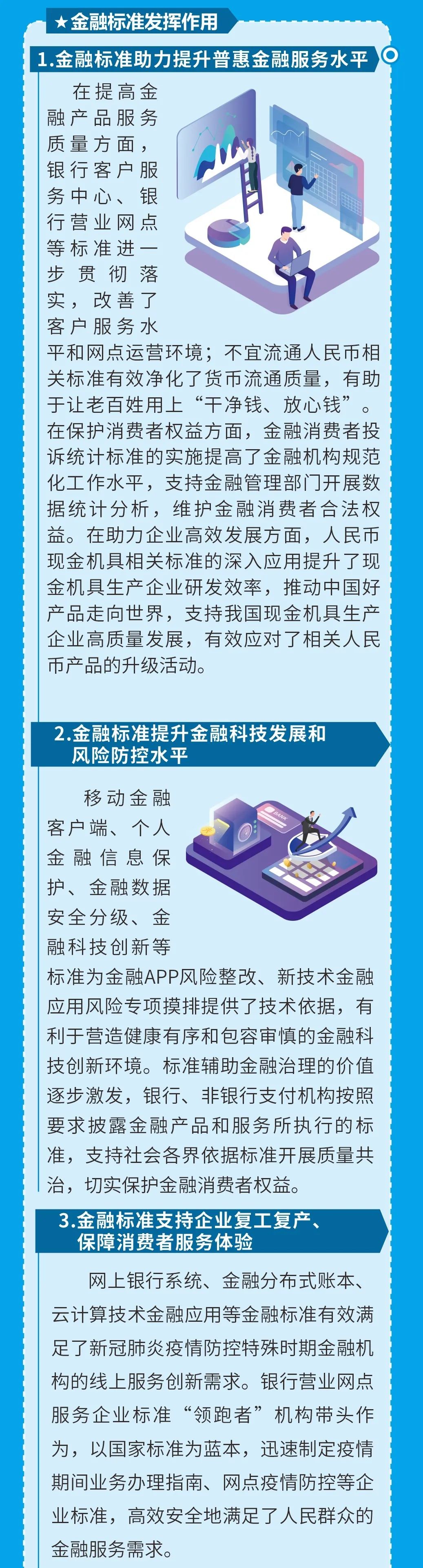 金融標準是金融業健康發展的技術支撐,是金融業治理體系和治理能力現代化的基礎性制度,中國人民銀行宣傳推廣重點金融標準,切實做好金融從業人員及消費者金融標準化宣教和普及工作,在行業內營造對標達標的良好氛圍,引導消費者使用達標服務與產品,進一步維護消費者合法權益。
