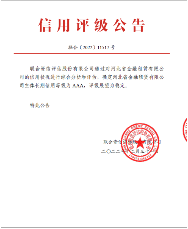 雙AAA!日前,河北省金融租賃有限公司正式獲得聯(lián)合資信評(píng)估股份有限公司AAA主體長(zhǎng)期信用等級(jí),加上此前持有的中誠(chéng)信國(guó)際信用評(píng)級(jí)有限公司AAA主體長(zhǎng)期信用等級(jí),成為首家獲得雙AAA主體信用等級(jí)的金租公司,為自身持續(xù)優(yōu)化融資結(jié)構(gòu)、拓展融資渠道、提升信用形象奠定了基礎(chǔ)。