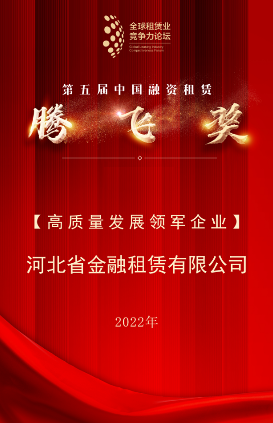 日前,第九屆全球租賃業(yè)競(jìng)爭(zhēng)力論壇年度峰會(huì)圓滿召開,河北省金融租賃有限公司(以下簡(jiǎn)稱“河北金租”或“公司”)再度攬下中國(guó)融資租賃“騰飛獎(jiǎng)”,榮獲“高質(zhì)量發(fā)展領(lǐng)軍企業(yè)”榮譽(yù)。全球租賃業(yè)競(jìng)爭(zhēng)力論壇峰會(huì)是一年一度的世界級(jí)租賃行業(yè)峰…